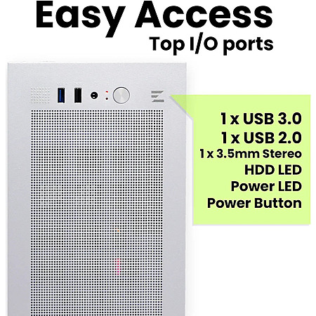 • I/O Ports: 1 x Power Button, 1 x Power LED, 1 x HDD LED, 1 x HD Audio, 1 x USB 3.0, 1 x USB 2.0