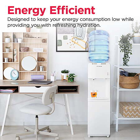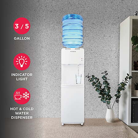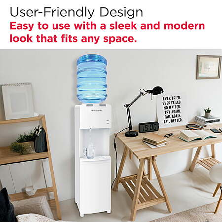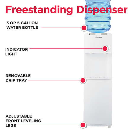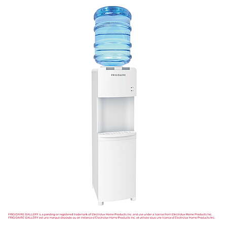 | Product Description: | This Frigidaire Water Dispenser distributes both cold and hot water. The dispenser is powered by a robust compressor cooler, that makes sure your water is always cold. This water bottle dispenser features a removable drip tray for easy cleaning, and adjustable front leveling legs for adjusting your desired angle of inclination. There is a safety lock for the hot water button to protect it from careless use. With a clean, look this water cooler would fit in any kitchen, office or dorm. There's an indicator displaying cooling and heating and power activity. This water bottle dispenser is an 100W cooling power and 420W heating power indicator that's easy to operate, and it accommodates 3- or 5-gal bottles. This hot and cold water dispenser's indicator lights let you check the unit's settings with a glance. HOT AND COLD WATER DISPENSING - Enjoy both hot and cold water at your fingertips. Perfect for families with small children, this water cooler dispenser features a safety lock on the hot water button to prevent accidental burns. FITS STANDARD 3 AND 5 GALLON BOTTLES - Compatible with both 3 and 5 gallon water bottles, this water cooler stand ensures you have an ample supply of water on hand for all your hydration needs. STAINLESS STEEL WELD TANK - Built with a durable stainless steel tank, this water cooler prevents overheating and ensures long-lasting performance, providing you with peace of mind and reliability. REMOVABLE DRIP TRAY FOR EASY CLEAN UP - Cleaning up spills is a breeze with the removable drip tray. It catches any overflow and can be easily removed and cleaned, ensuring your space stays tidy, while avoiding accidental spills. ADJUSTABLE FRONT LEVELING LEGS - Features adjustable front leveling legs to ensure the water dispenser remains stable on any surface. POWER-SAVING AND LOW NOISE - Designed with energy efficiency in mind, this hot and cold water dispenser operates quietly and consumes minimal power, making it a smart choice for your home. ELECTRICITY SHOCK-PROOF DESIGN - Safety is top of mind with the electrical shock-proof design, ensuring the water dispenser is safe to use in any space including your garage, basement, trailer, condo, or dorm. STYLISH AND MODERN DESIGN - Enhance the look of any room with this top load water dispenser's sleek and stylish design. Its modern appearance complements any decor, making it a great addition to your home or office. |