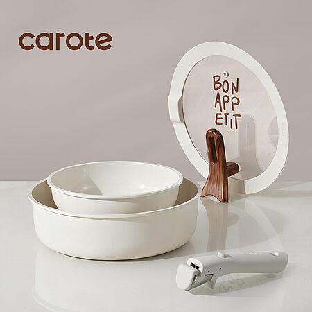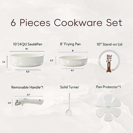 CAROTE Ceramic Nonstick Cookware Set: 8" Fry Pan, 10" Sauté w/ Lid, & Detachable Handle (Cream White) for
