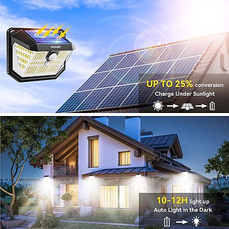 Model: TECKNET 231 LED Solar Motion Lights Outdoor Waterproof, 4 Pack 300° Angle & 3 Lighting Modes PIR Motion Sensor Security Solar Wall Lights IP65 for Fence Front Door Yard Deck Garden Garage