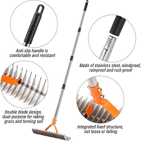• From spring dethatching (March-May) to fall leaf cleanup (Sept-Nov), this 6-in-1 tool handles turf renovation, compost turning, gravel leveling, and pine needle removal. Includes lifetime warranty against bending/rusting.