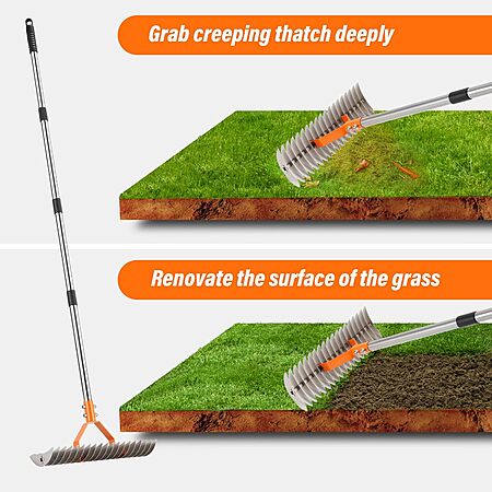 62" Adjustable Thatch Rake - 19-Tine Lawn Dethatcher with Nickel Steel Tines, Heavy Duty Ergonomic Handle for Spring Lawn Care, Soil Aeration & Yard Cleanup&Turf Renovation (Silver) $11.99