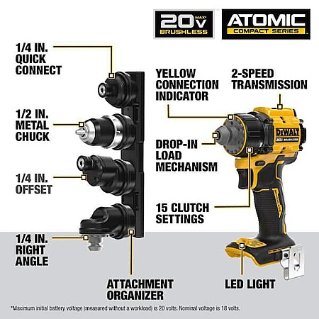 Model: ATOMIC 20 V MAX Lithium-Ion 1/2 in. Multi-Head Drill Driver with 20 V MAX XR Power Stack 3.5 Ah Battery and Charger