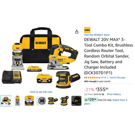 DEWALT 20V MAX* 3-Tool Combo Kit, Brushless Cordless Router Tool, Random Orbital Sander, Jig Saw, Battery and Charger Included (DCK307D1P1) $355
