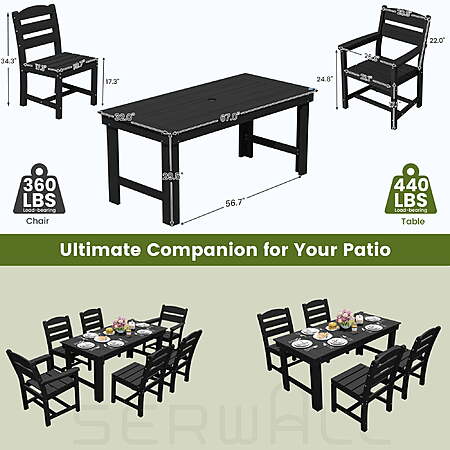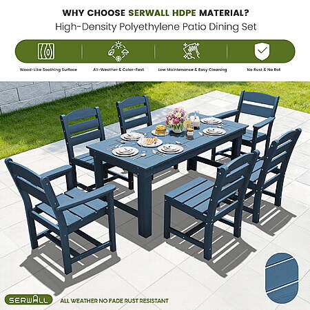 Serwall via Walmart [walmart.com] has 7-Piece Serwall HDPE Patio Dining Set w/ 59" Table and 6 Chairs for $599.99 as listed below. Shipping is free.