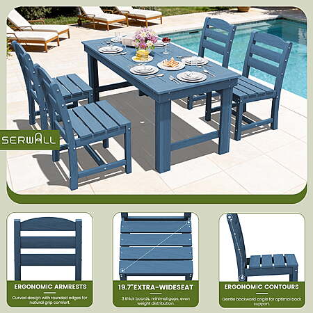 Model: SERWALL 7-Piece HDPE Outdoor Dining Table Set, All-Weather 67-Inch Patio Table and 6 Armless Chairs for Deck, Lawn or Garden, Blue