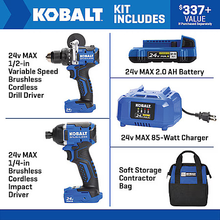 • Kobalt 24-volt cordless combo kit includes 1/2-in brushless drill/driver, 1/4-in brushless impact driver, 2.0Ah battery, 85-watt charger and soft storage bag