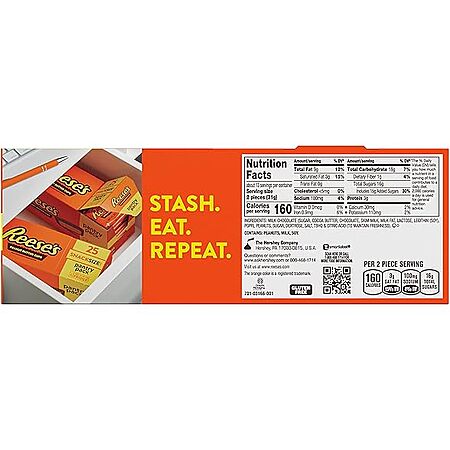 • Includes 25 individually wrapped kosher and gluten free REESE'S peanut butter cups in a stackable box to protect your snack size candy treats